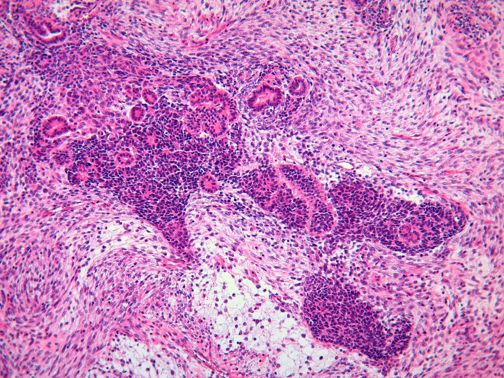 Epithelial elements usually consist in small tubules or rosette like structures, but also can have mucinous, glomerular o squamous differentiation