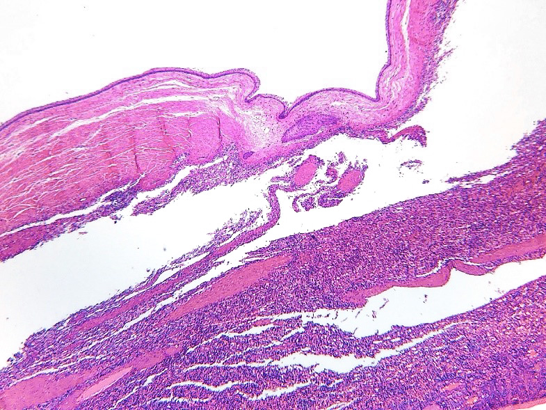 Vista panorámica de la pared del quiste constituida por epitelio escamoso, tejido conectivo y rodeada de pulpa roja
